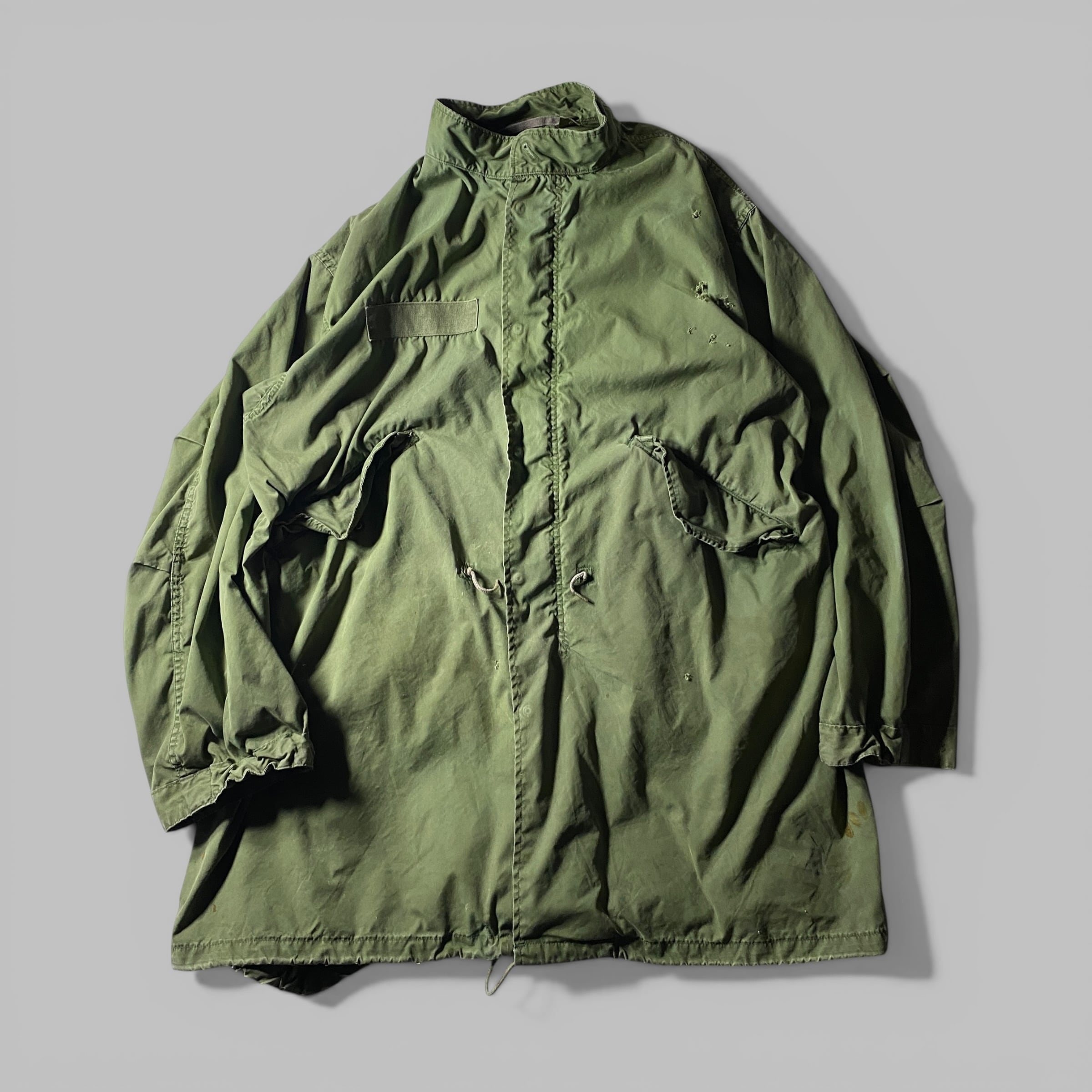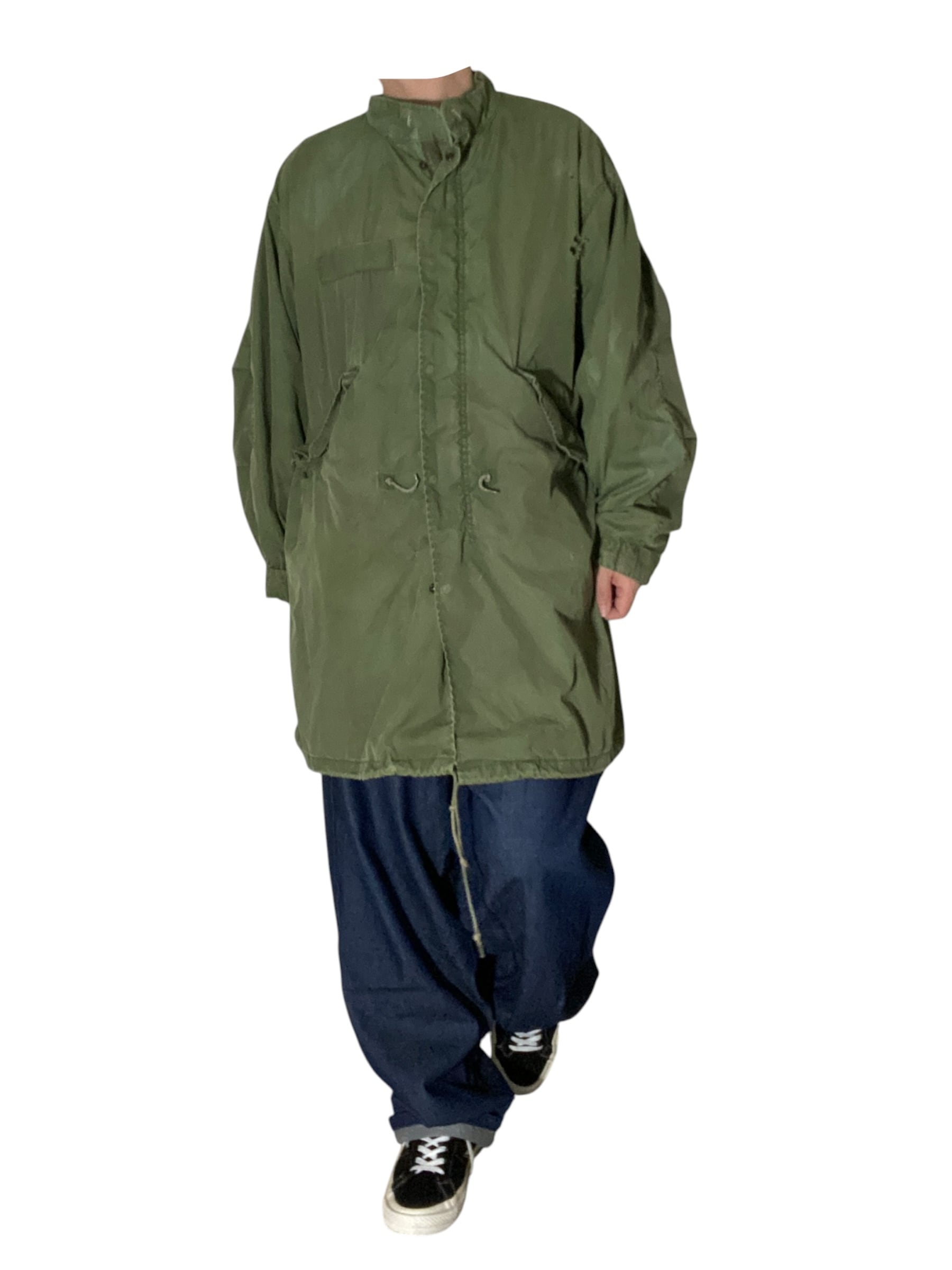 米軍名作M65フィッシュテールパーカー、モッズコートの原点にして完成形。ざっくり羽織れるロングシルエットに、ウエスト・裾のドローコードでシルエット調整も自在。ダメージや経年変化も含めて“リアルな戦闘帰り感”が漂う一着で、無骨な雰囲気をそのままスタイルに落とし込める個体です。