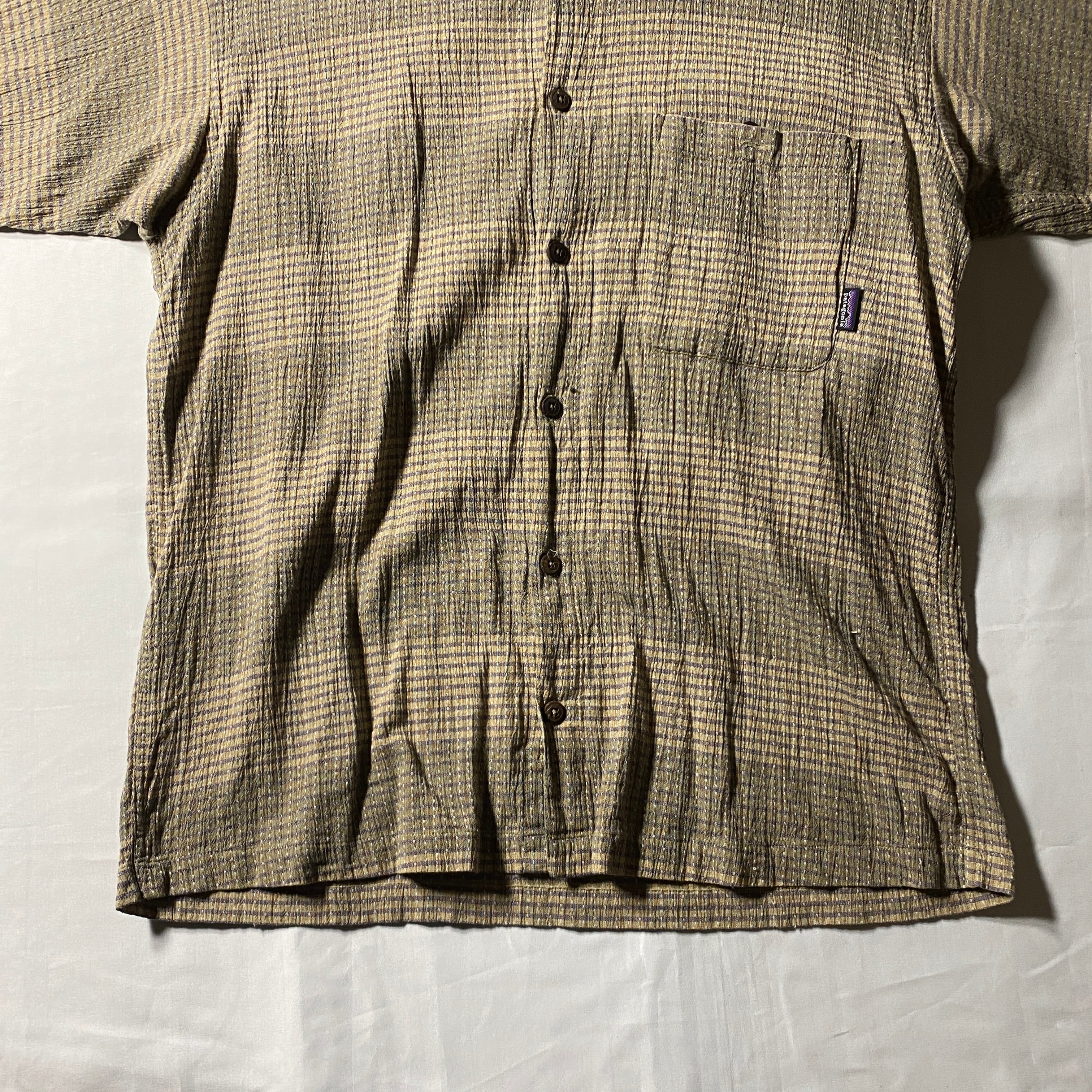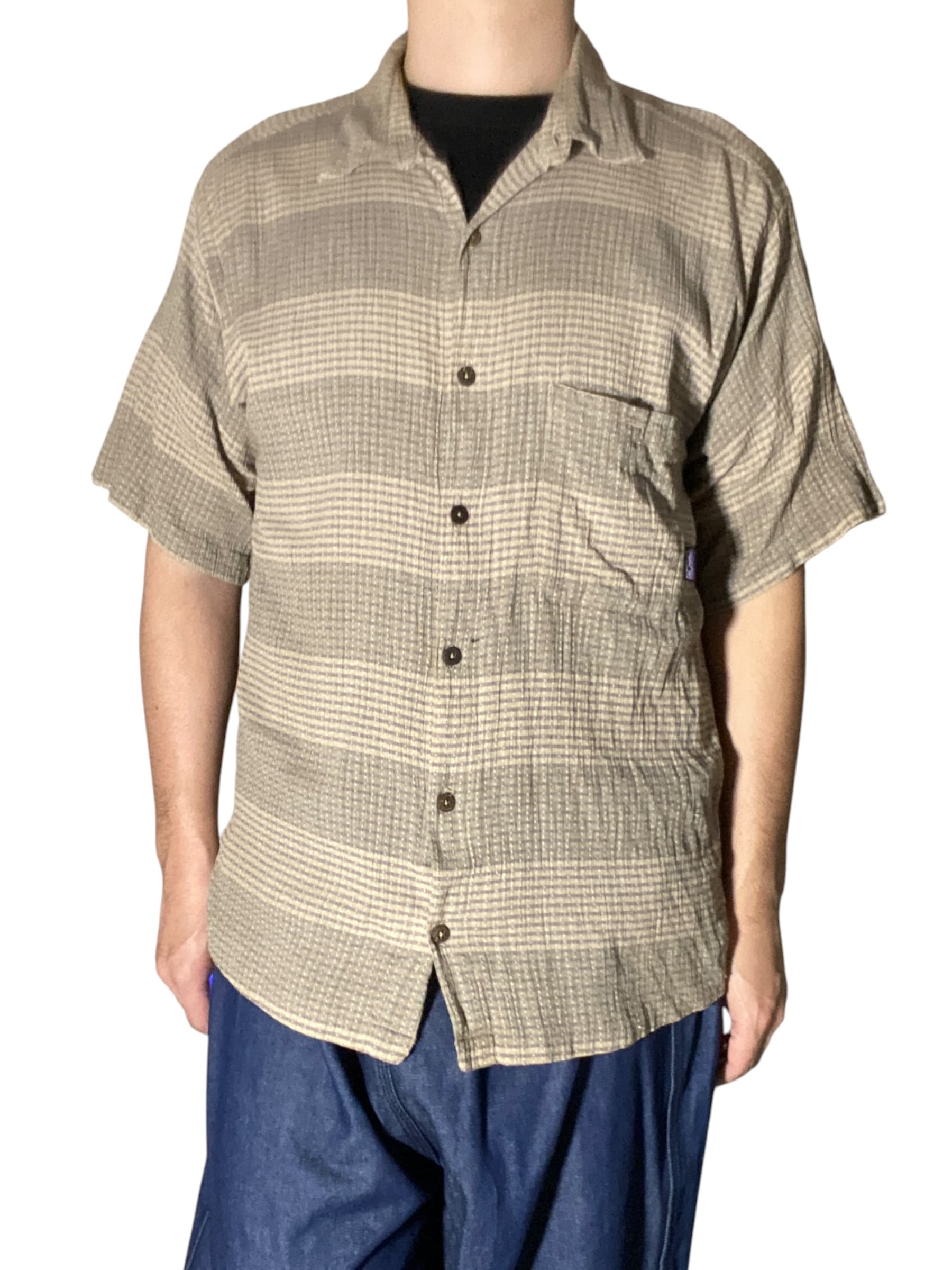 凹凸のある織りが特徴的なオーガニックコットン素材を採用した一枚。細かなチェックパターンにナチュラルな配色が重なり、アウトドアブランドらしい機能美と都会的な落ち着きを両立。通気性と肌離れの良さから夏場でも快適に着用でき、シンプルながらも素材で差がつくアイテム。パタゴニアらしい環境配慮の思想を纏いながら、日常に溶け込む一着です。