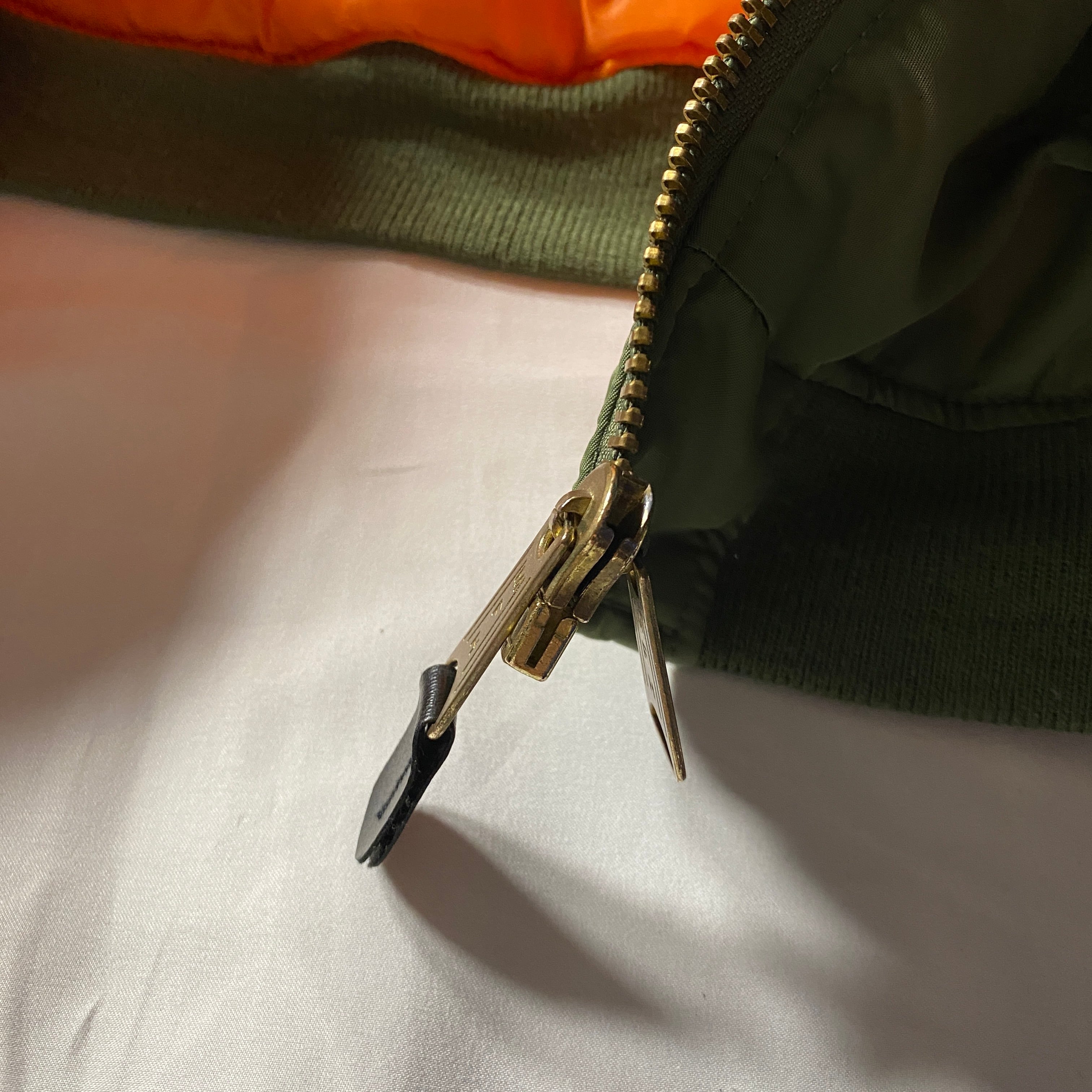 民間向けに展開されたMA-1フライトジャケット。US AIR FORCE採用モデルをルーツに持つこの型は、1950年代に誕生しジェット機時代に対応するナイロンジャケットとして進化した名作。オリーブのシェルにレスキューオレンジのライニングという王道配色がしっかり踏襲され、無骨さと実用性を両立。ゆったりしたXLシルエットの中でも、今時のオーバーサイズスタイルにハマるバランスの良い個体をピックアップしており、着るだけでシルエットが完成する一着。
