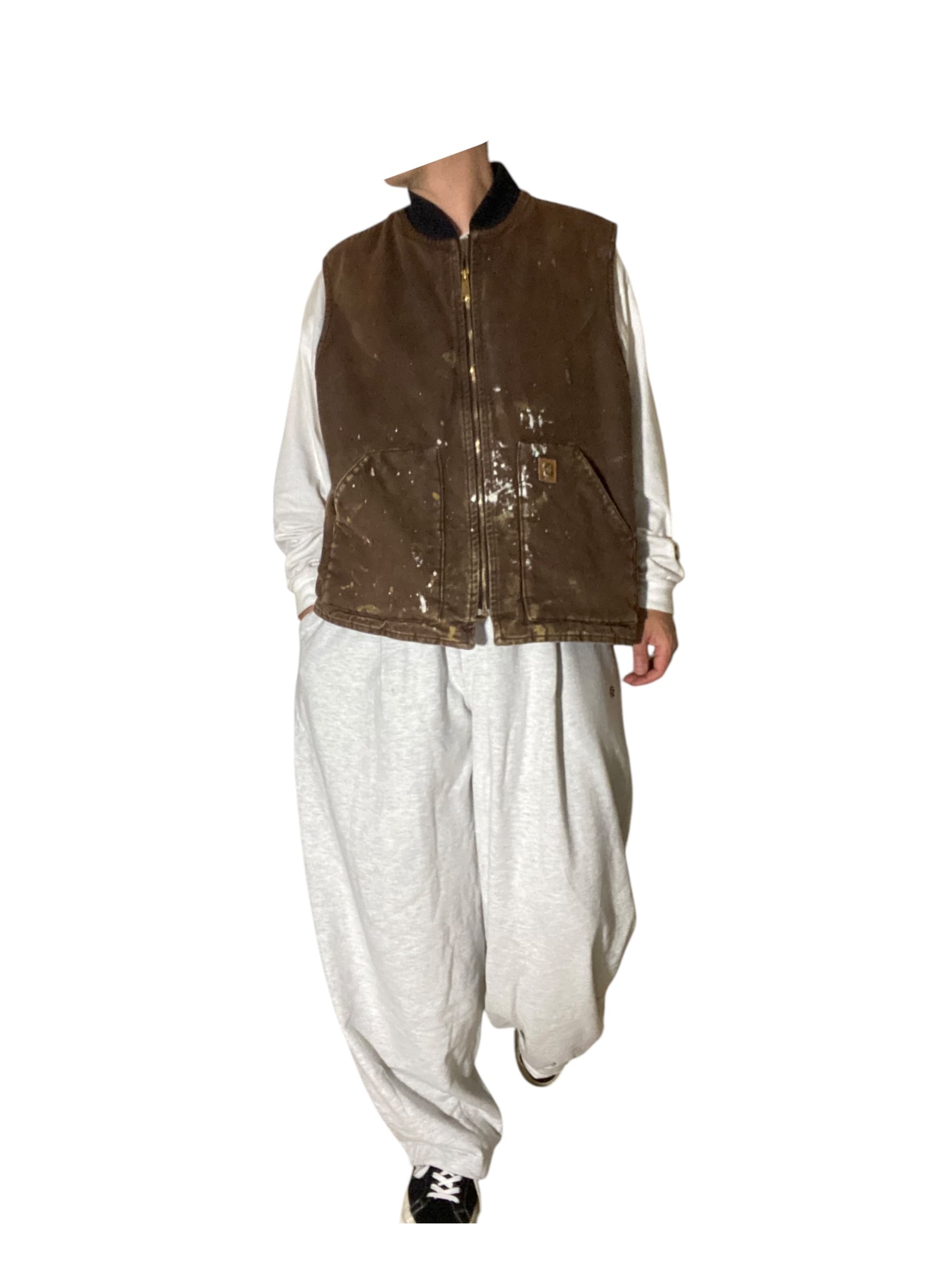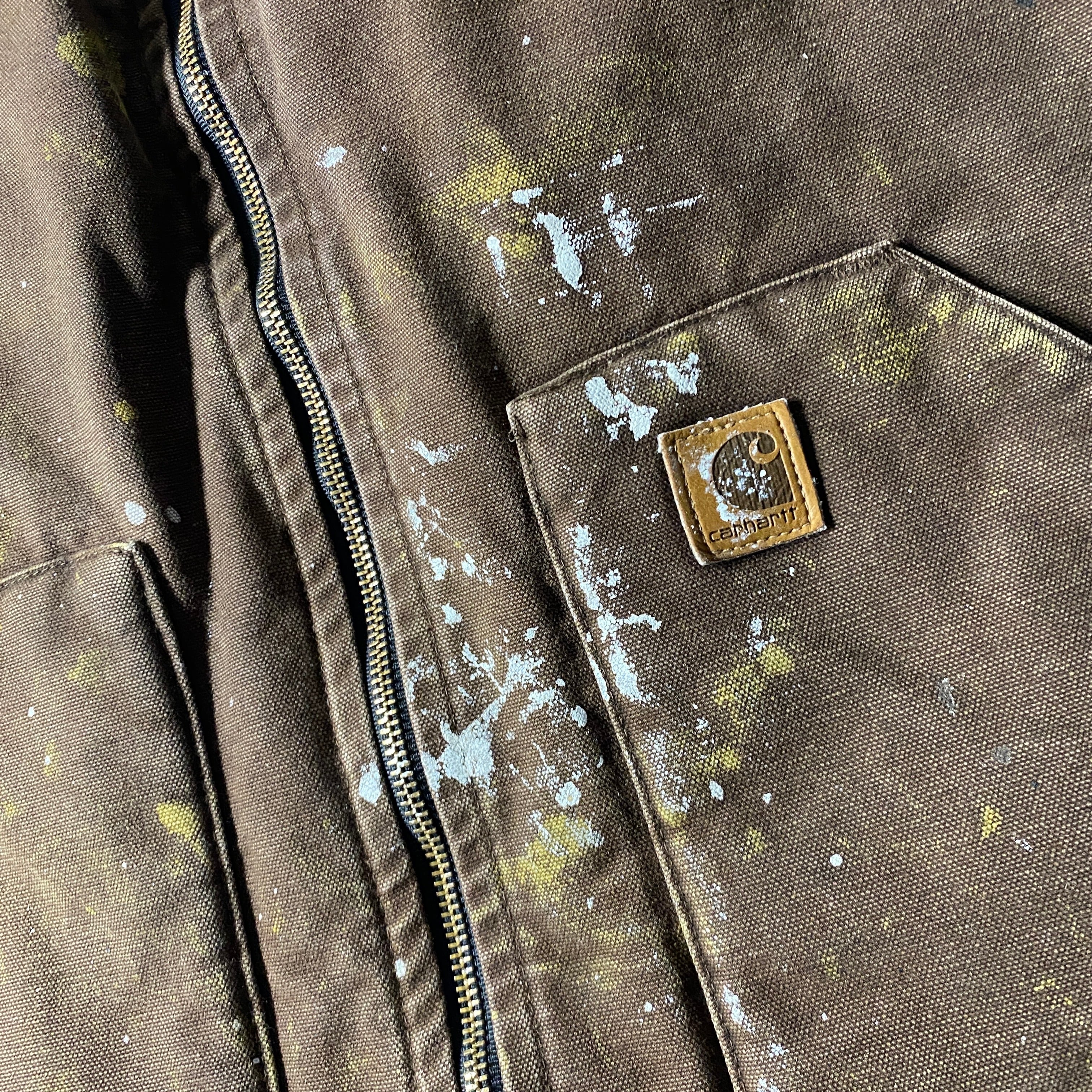 Carharttのダックベストは本来ワーク現場での耐久性を目的に設計されたタフな一着で、本個体もリアルなペンキ飛びが加わることで唯一無二の表情に昇華。タグ表記は「Made in Mexico from USA components」で、アメリカ製資材を用いた北米生産背景もポイント。シェルはコットンダック、裏地はナイロンキルティングで防寒性も確保されており、ワークウェアとしての機能をそのままストリートに落とし込める仕様。計算では出せないランダムなペイントの散り方は、まるでアクションペインティングのようなアートピース感すら漂わせ、無骨さの中に遊びの効いた一着です。