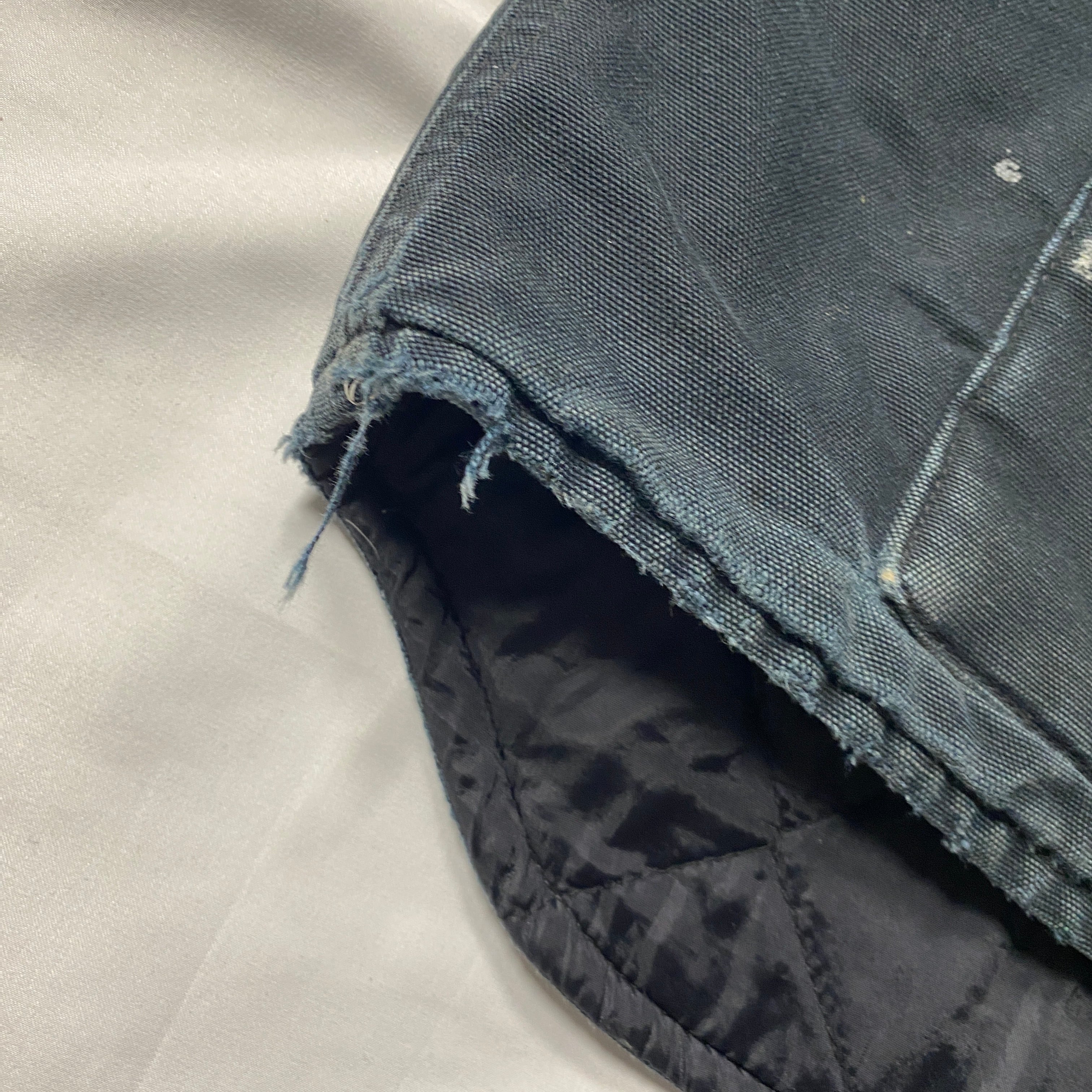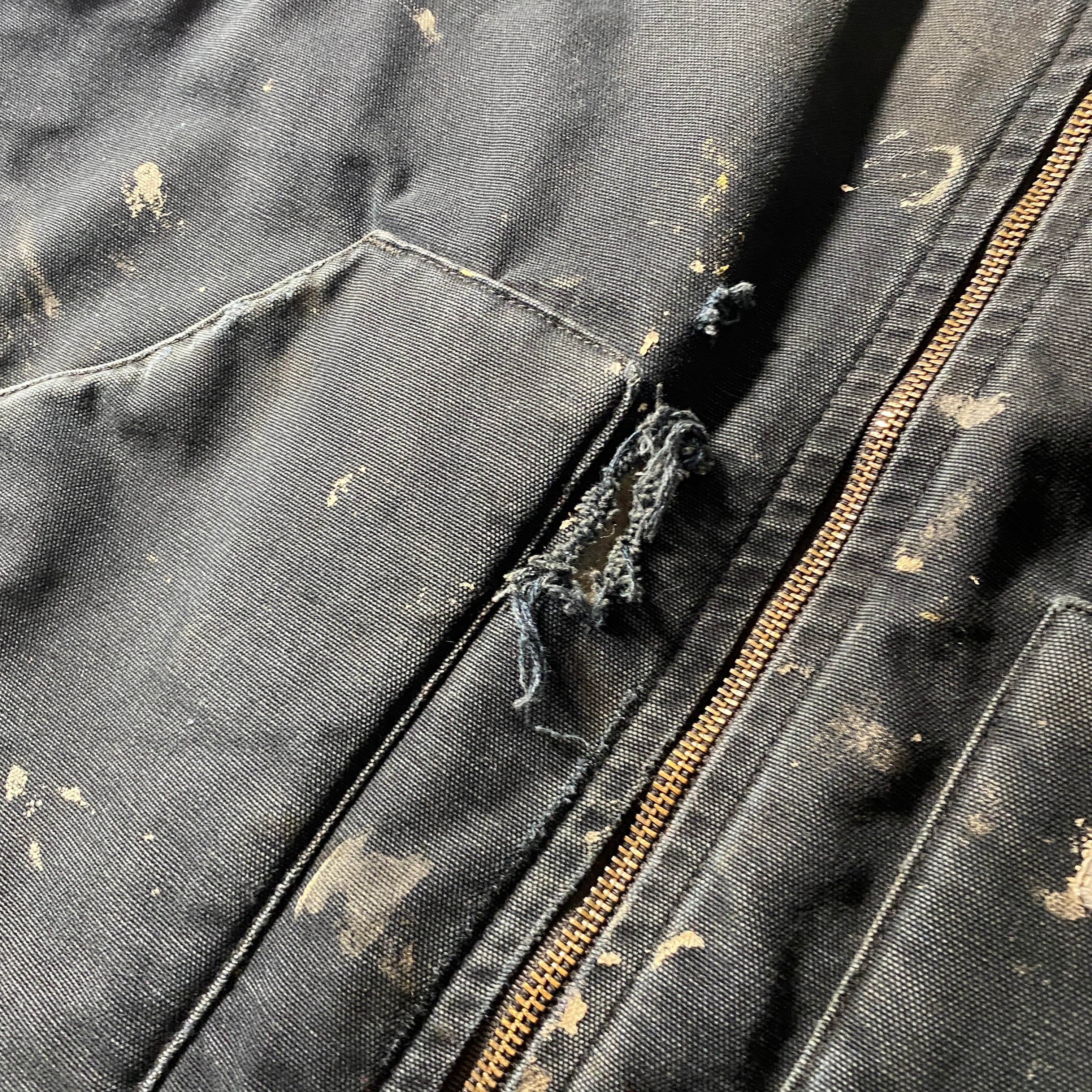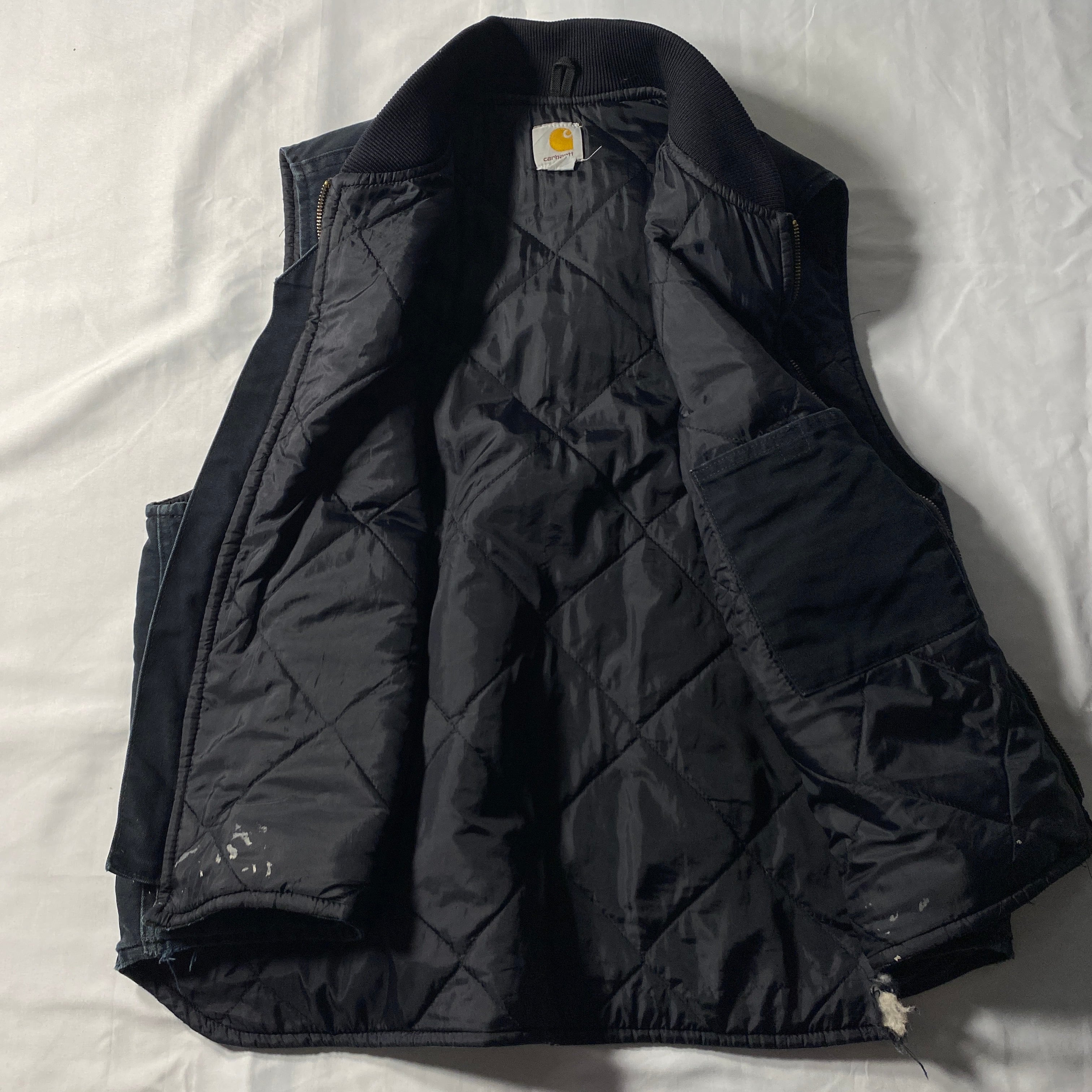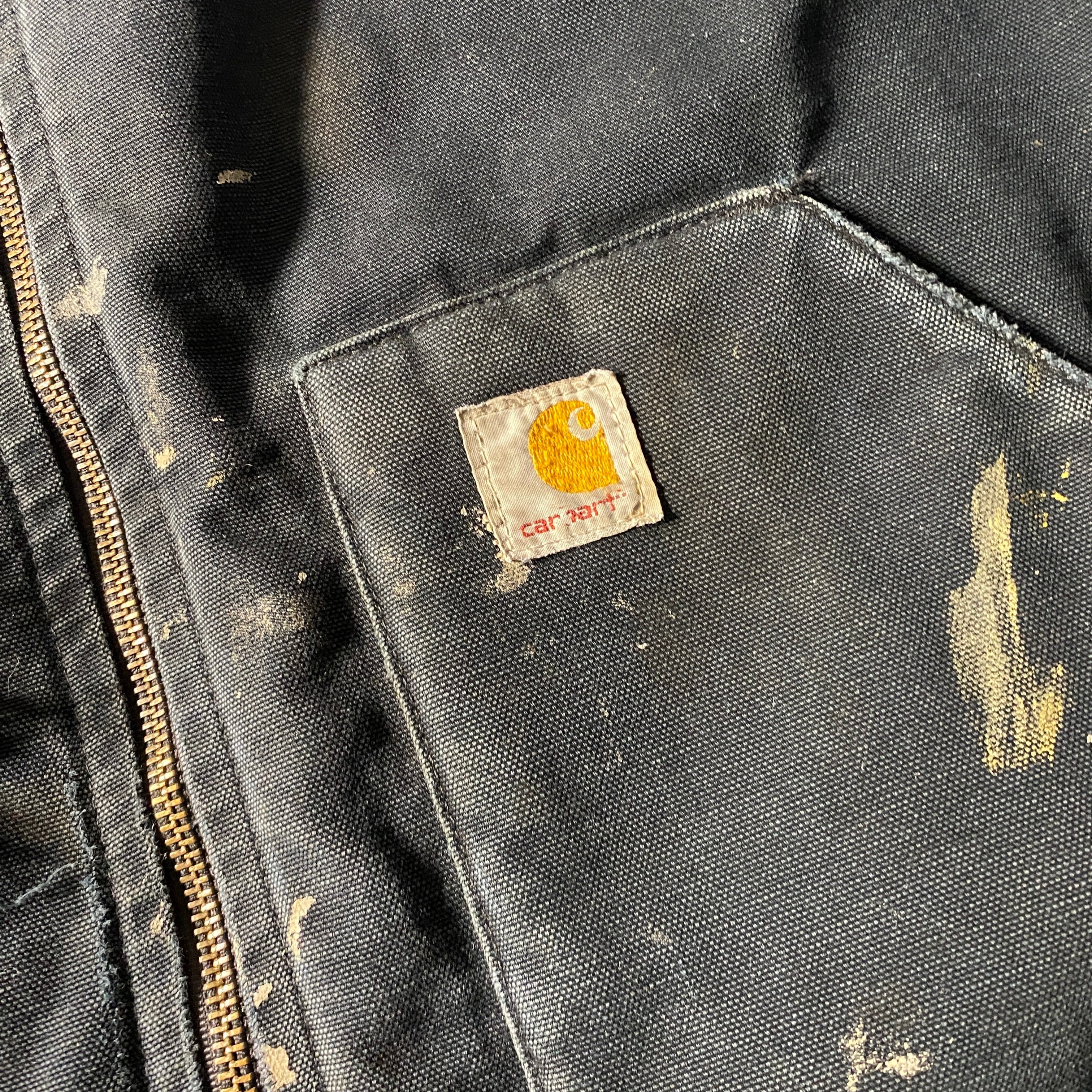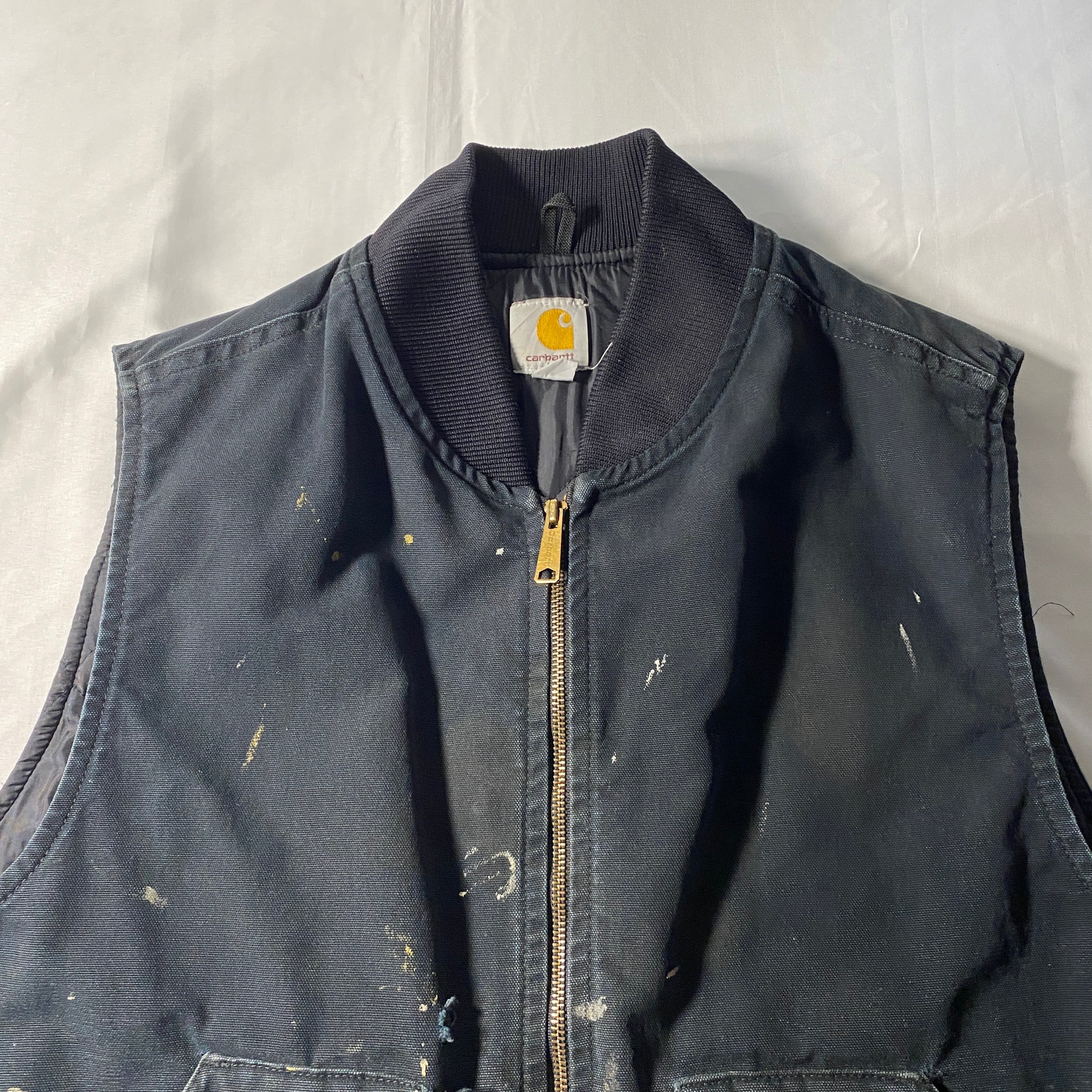 Carharttの定番ダックベストに、リアルワーク由来のペンキ飛びとダメージが重なった雰囲気系個体。タグは「Made in Mexico from USA components」で、アメリカ企画の流れを汲む北米生産背景が見て取れる一着。コットンダックのタフな外装に対し、裏地はナイロンキルティング仕様で防寒性も確保。ブラックボディにランダムに乗るペイントは、意図せず完成した一点物のアートピースのような存在感を放ち、無骨なワークウェアをストリートに昇華する説得力を持つ仕上がりです。