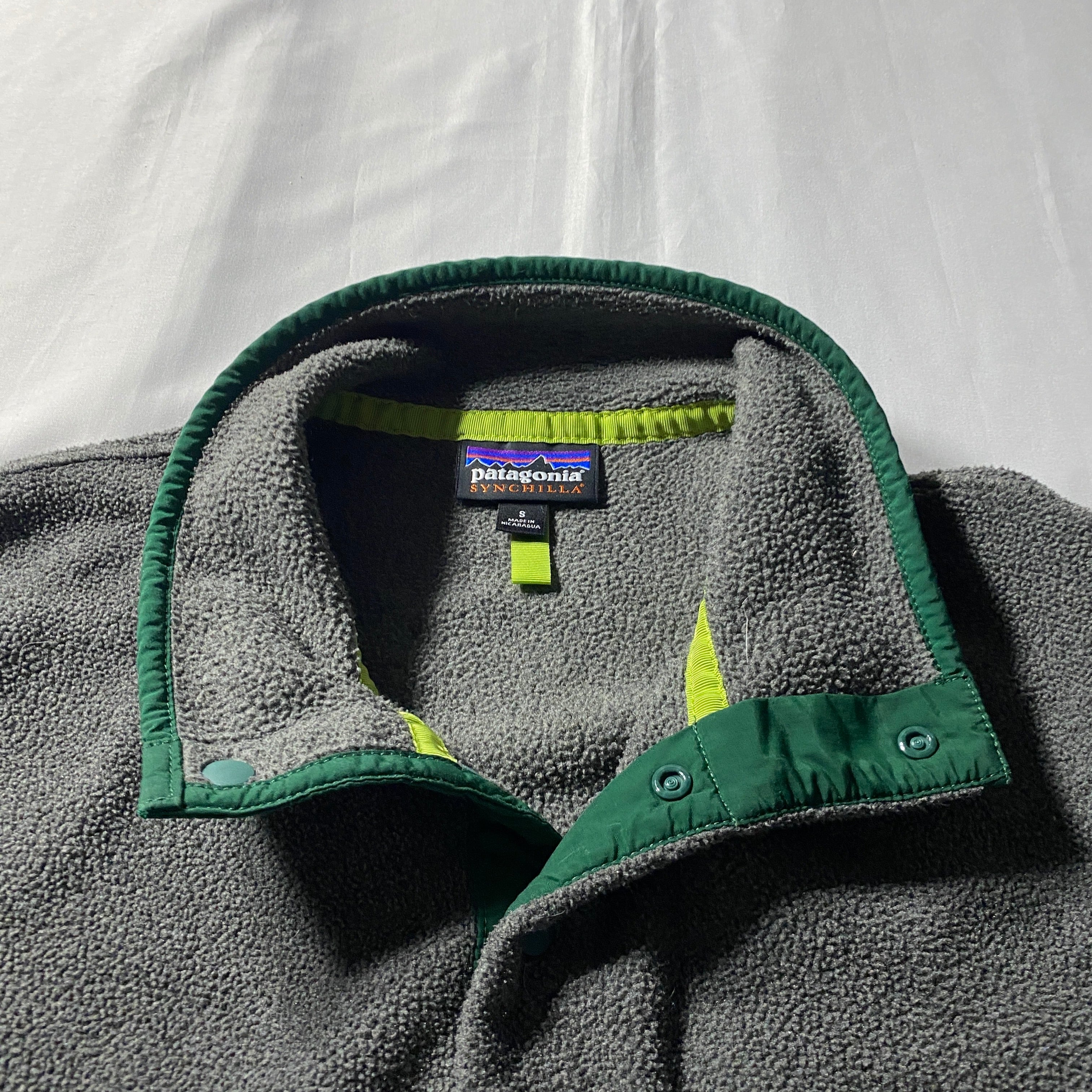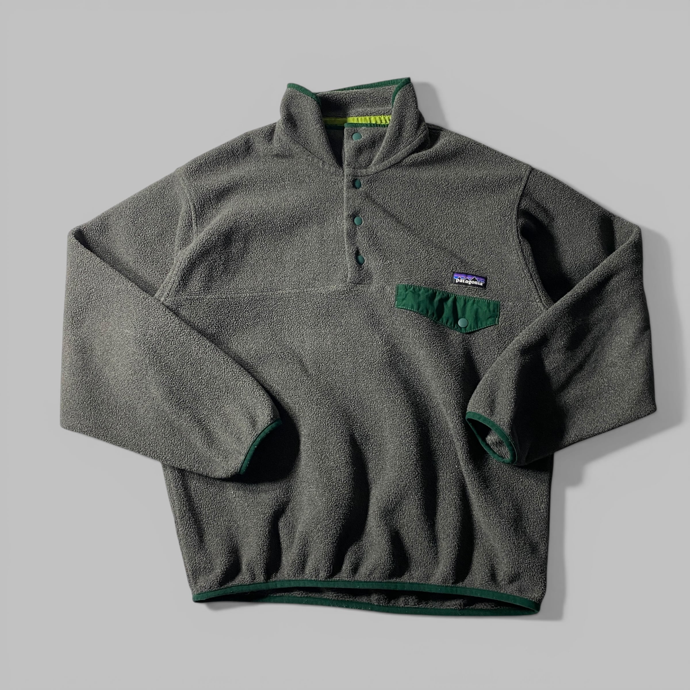Patagoniaの定番SynchillaスナップTは1990年代以降フリースの代名詞としてアウトドアシーンに定着した名作で、軽量かつ高い保温性を持つリサイクルポリエステル素材が特徴。本個体はニカラグア製で、グレーにグリーンのパイピングと胸ポケットの配色が絶妙なアクセントになっています。過酷な自然環境での実用性を追求した背景を持ちながらも、街着としても完成されたバランスで、焚き火の前でもコンクリートの上でも違和感なく溶け込む一枚です。