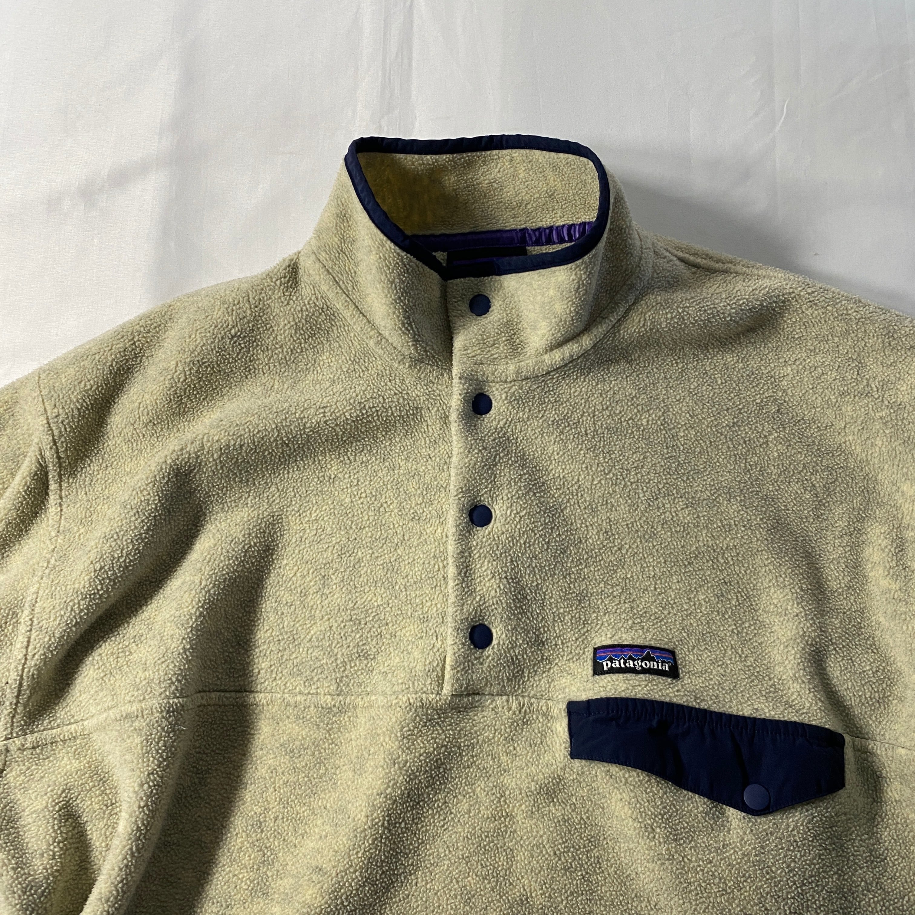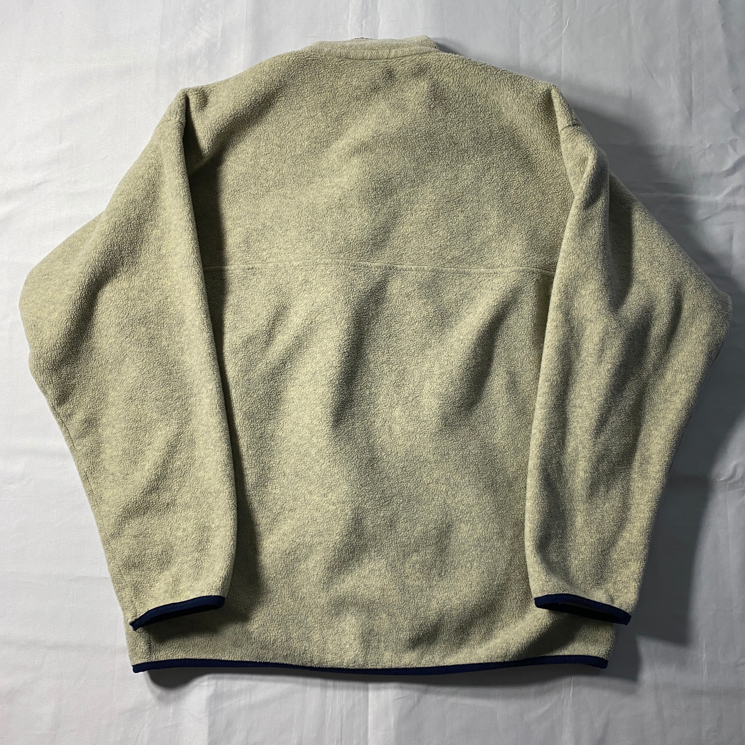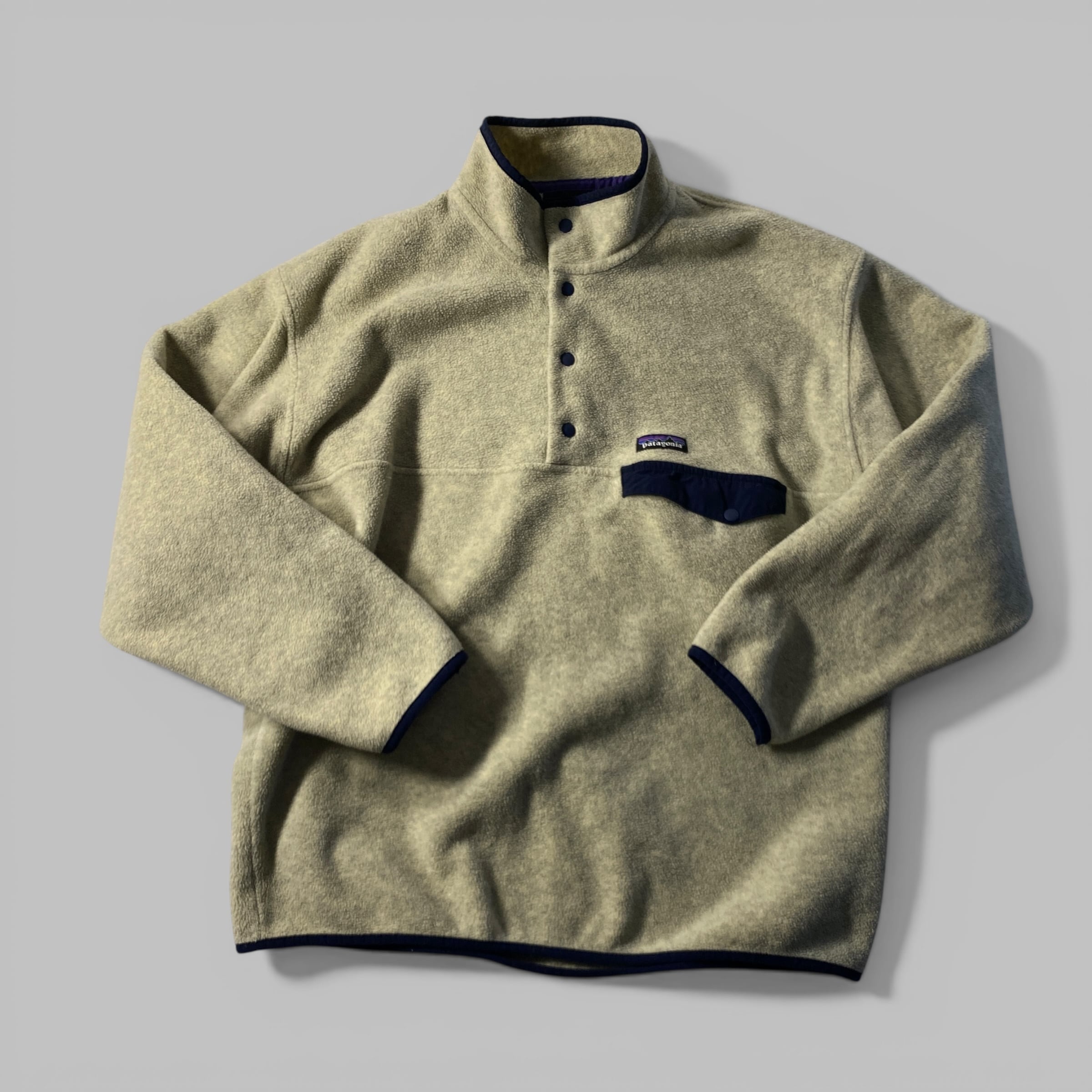 2017年製SynchillaスナップTはリサイクルポリエステルを用いた現行系モデルで、クラシックな意匠を継承しつつ環境配慮の文脈も感じさせる一着。アイボリーボディにネイビーのパイピングが効いた配色はシンプルながら完成度が高く、アウトドアブランドらしい機能性と都会的な抜け感を両立しています。軽量で保温性も高く、焚き火からカフェまでシームレスに活躍する万能フリースです。