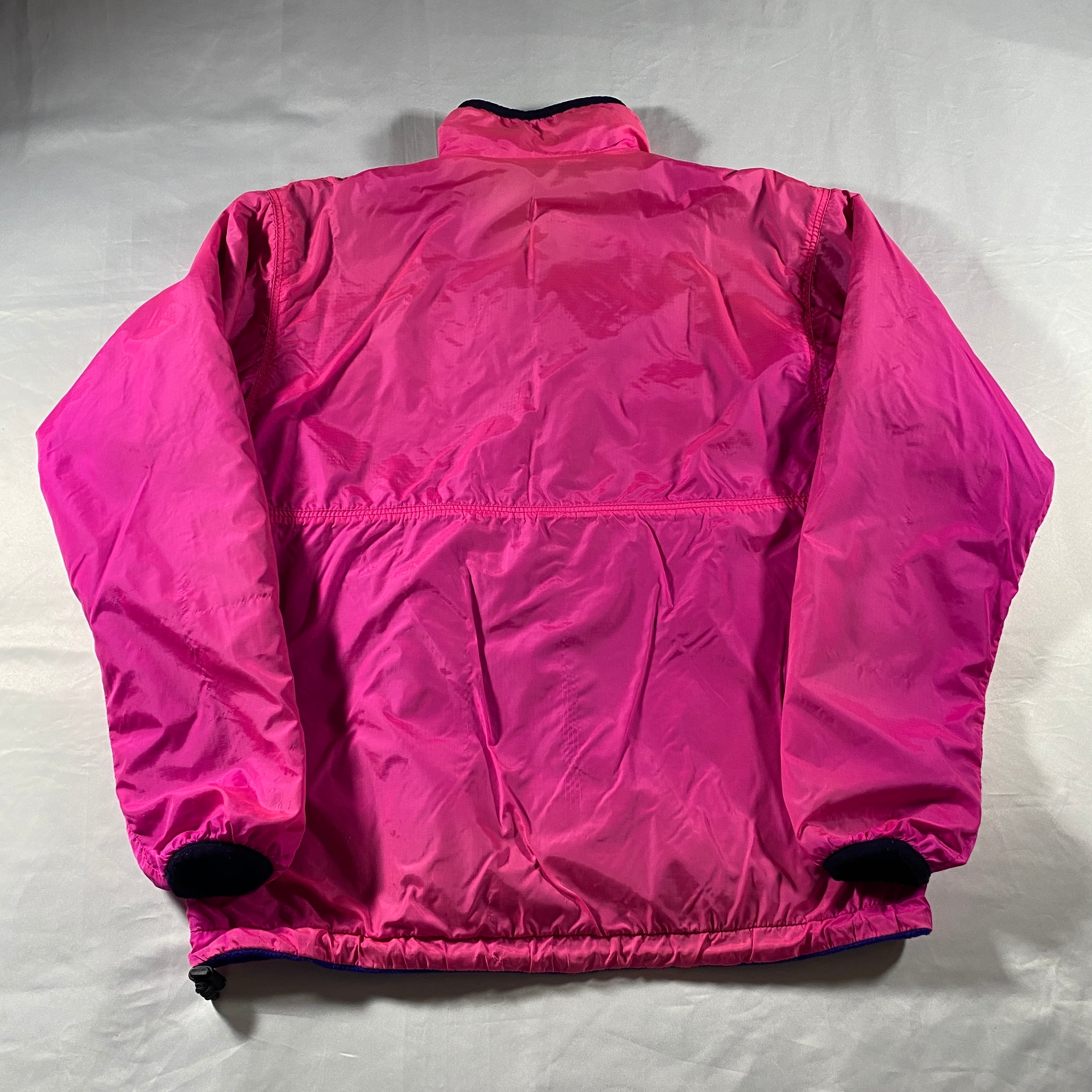 Patagoniaの名作グリセードは90年代アウトドアカルチャーを象徴するリバーシブルジャケットで、ナイロンとフリースを瞬時に切り替え可能な実用性が魅力。本個体はビビッドなピンクナイロンに対し、裏面は深みのあるパープルフリースという強烈なカラーコントラスト。単なる防寒着に留まらず、スタイリングの主役として機能する完成度の高さが光る一着。気分で“攻める日”と“落ち着く日”を選べる、90sらしい遊び心全開のリバーシブルです。
