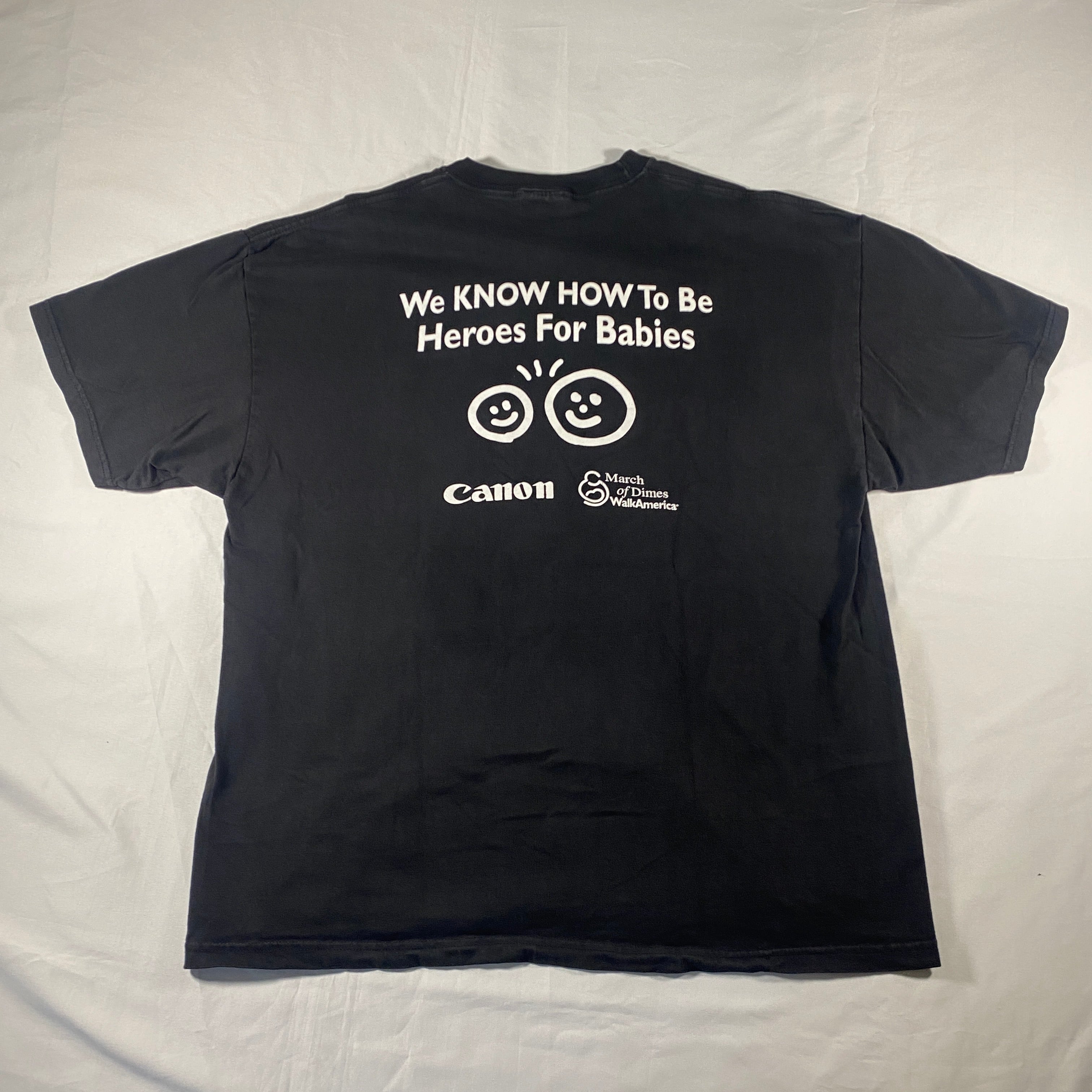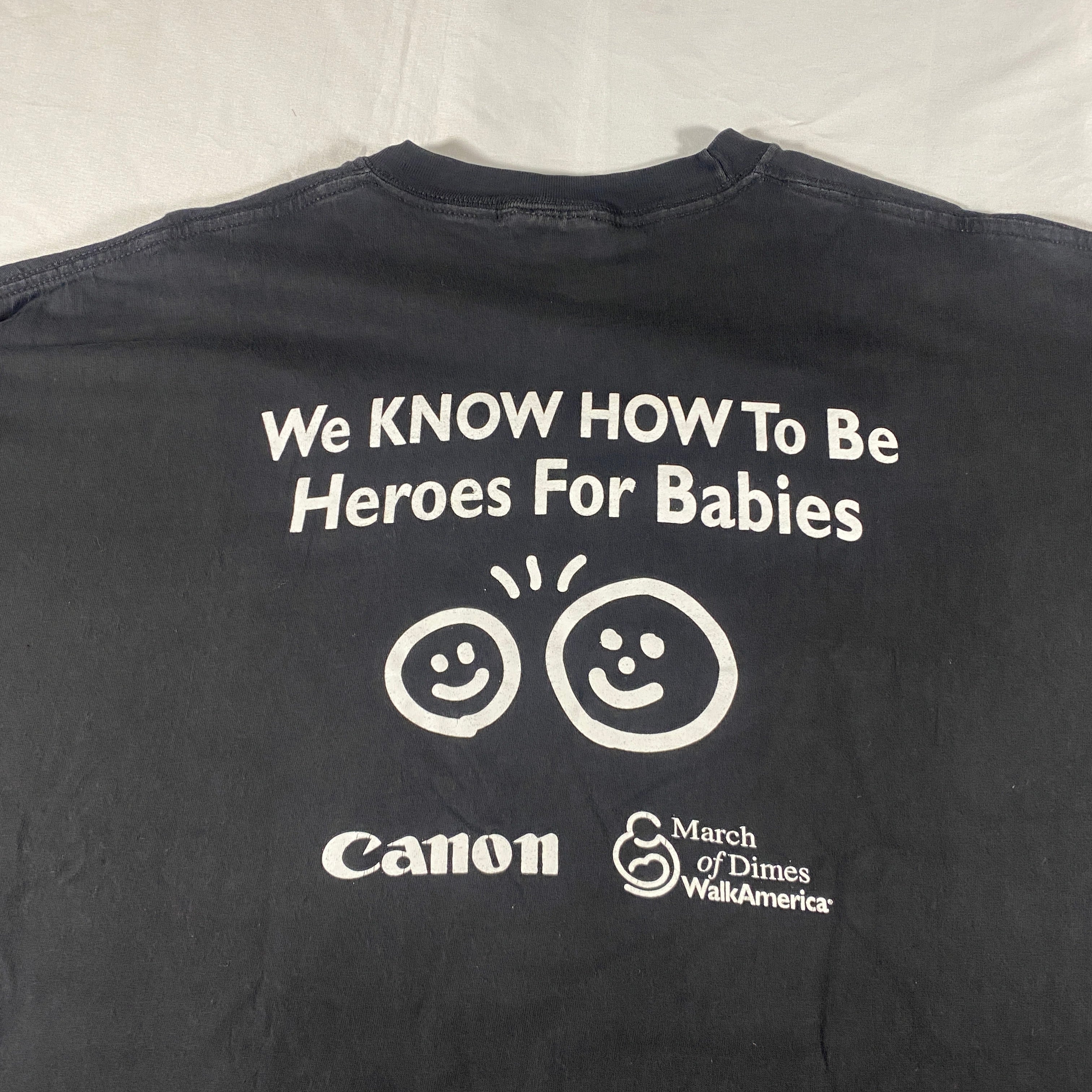 Canonの企業ロゴTに加え、背面には「We KNOW HOW To Be Heroes For Babies」と記されたチャリティープリント。March of Dimes WalkAmericaとの協賛アイテムで、医療支援をテーマにした背景が魅力。ボディはHanes BEEFY-TのUSA製、肉厚コットンに経年フェードが乗り、企業モノながらストーリー性も抜群。無機質なロゴと温かいメッセージのギャップが刺さる一枚。
