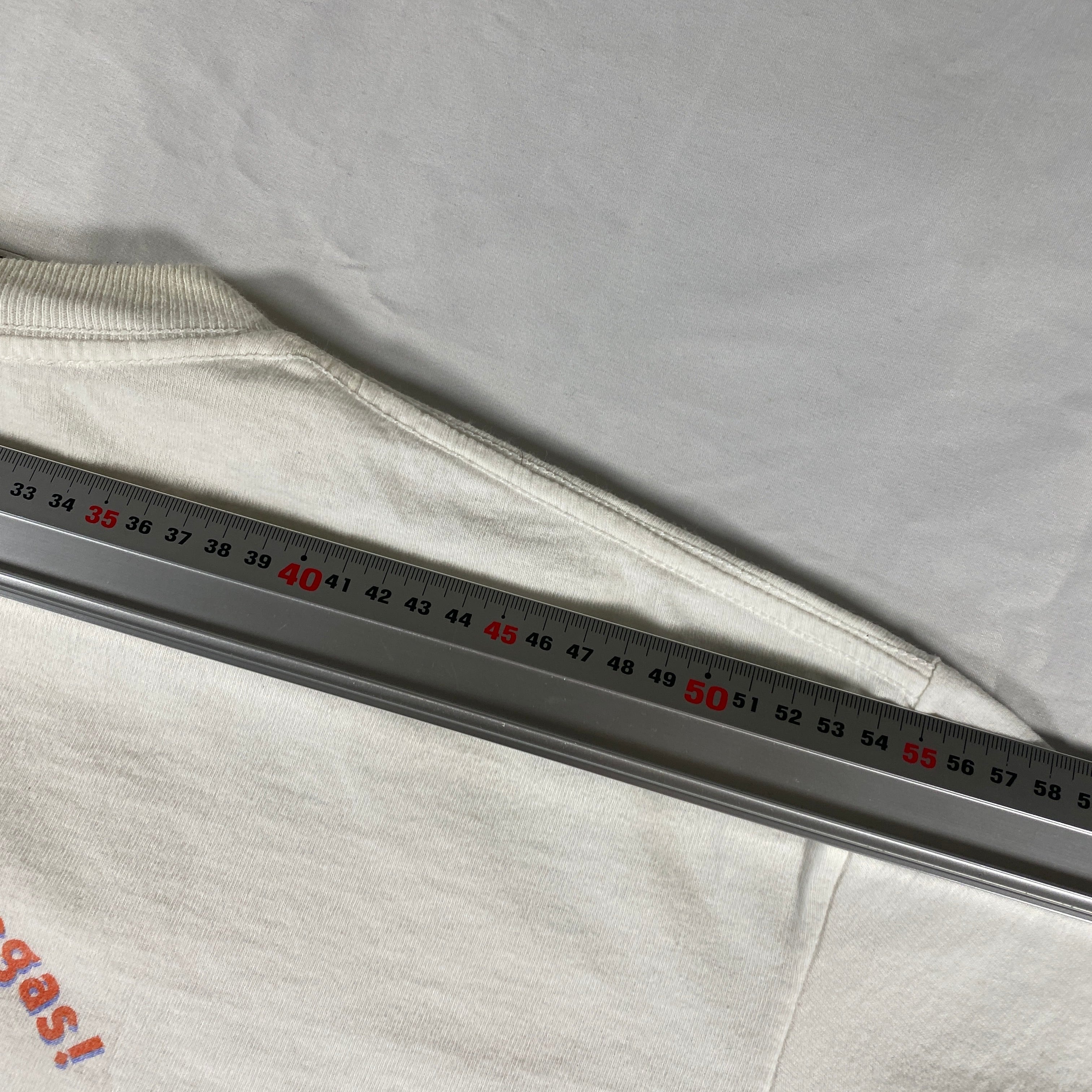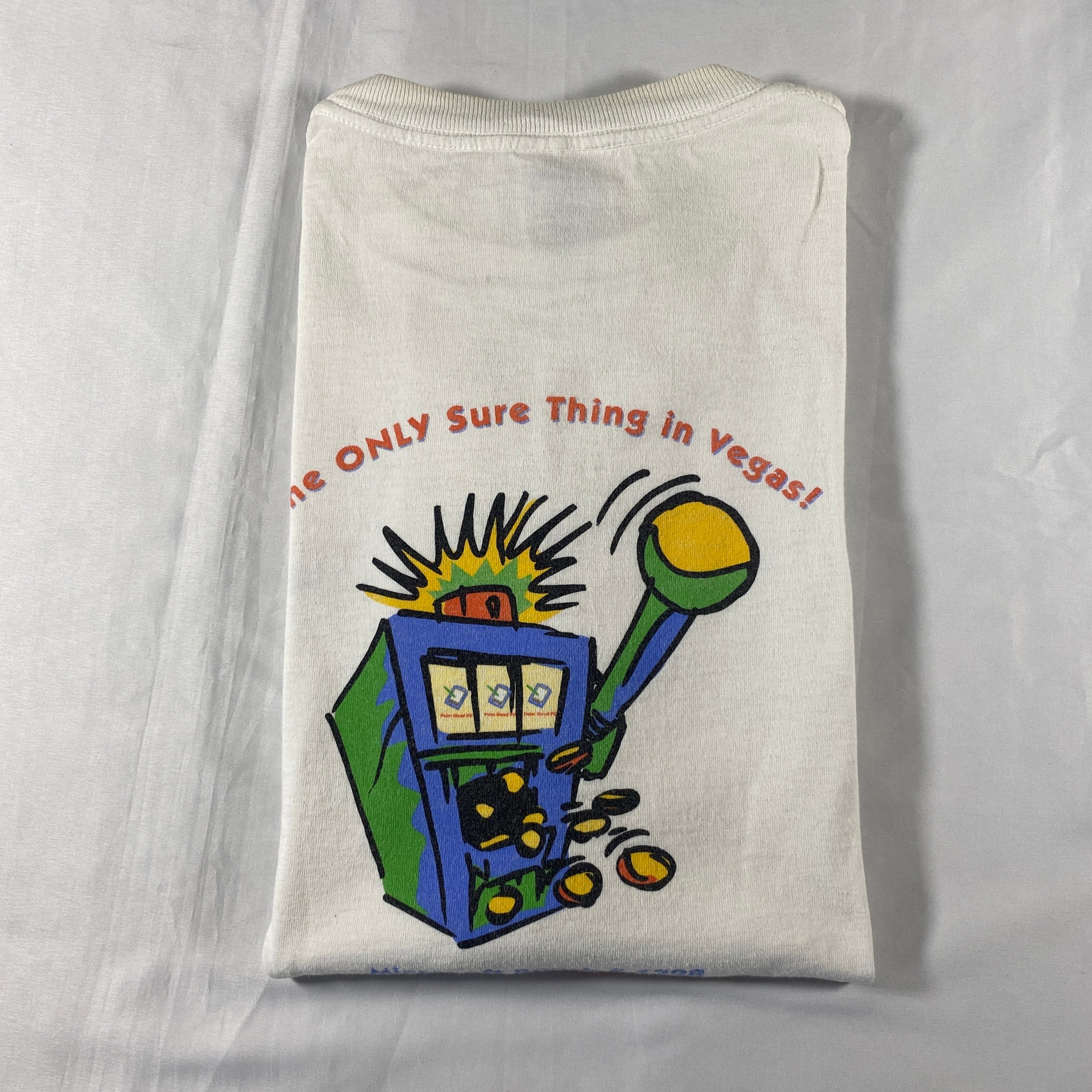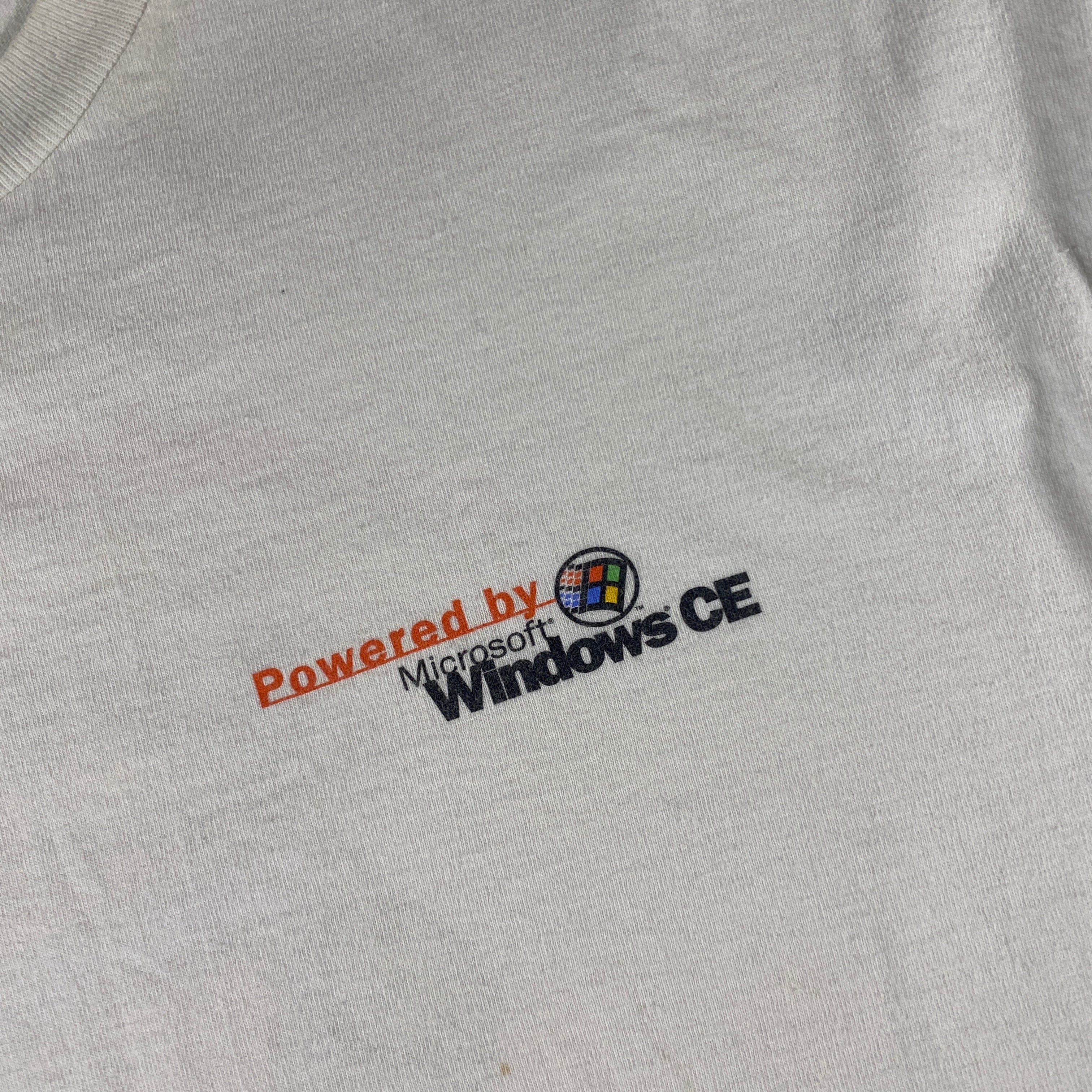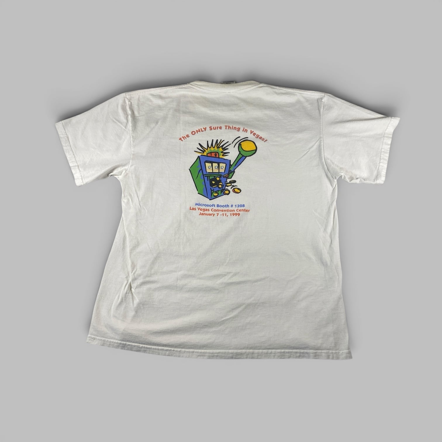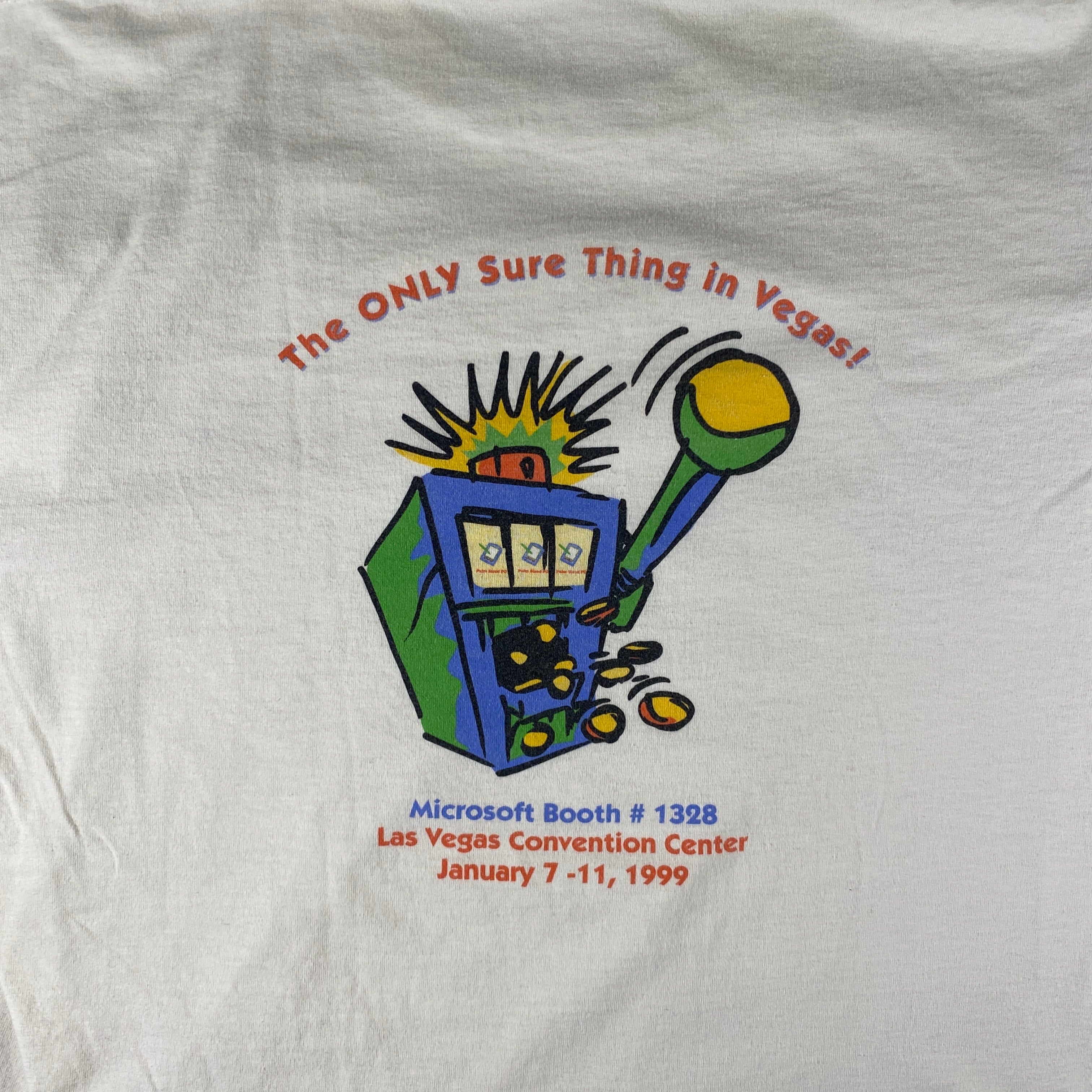 1999年ラスベガスで開催された展示会「Microsoft Booth #1328」のプロモーションTシャツ。バックのスロットマシンは“Vegas×テクノロジー”を掛け合わせたユーモアあるグラフィックで、「The ONLY Sure Thing in Vegas!」というコピーも秀逸。Windows CEは当時のモバイルOSとしてPDAや組み込み機器に使われた先進的存在で、その過渡期の空気を閉じ込めた一枚。企業モノながら遊び心が効いた、いま見ると逆に新鮮なテックカルチャーの記録。