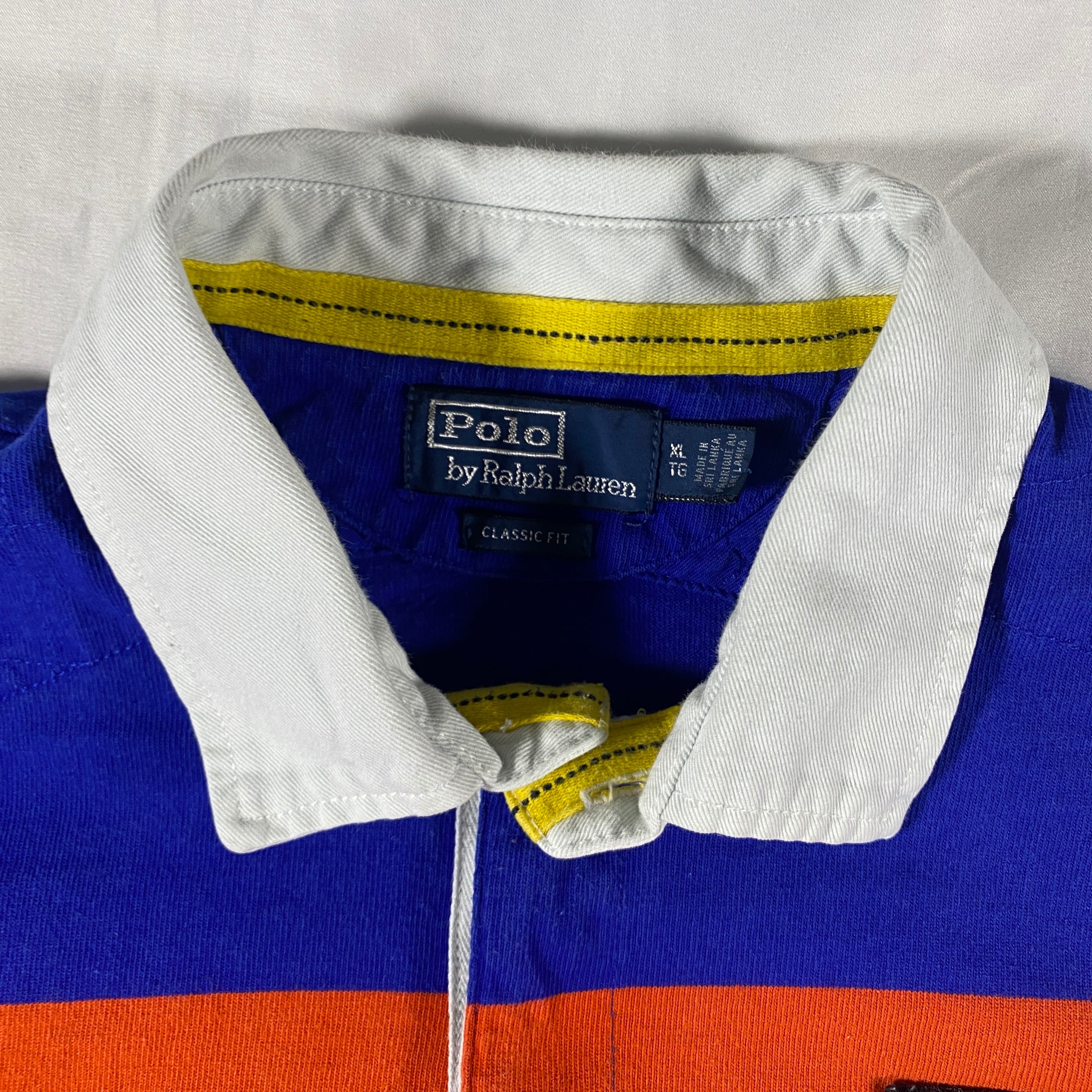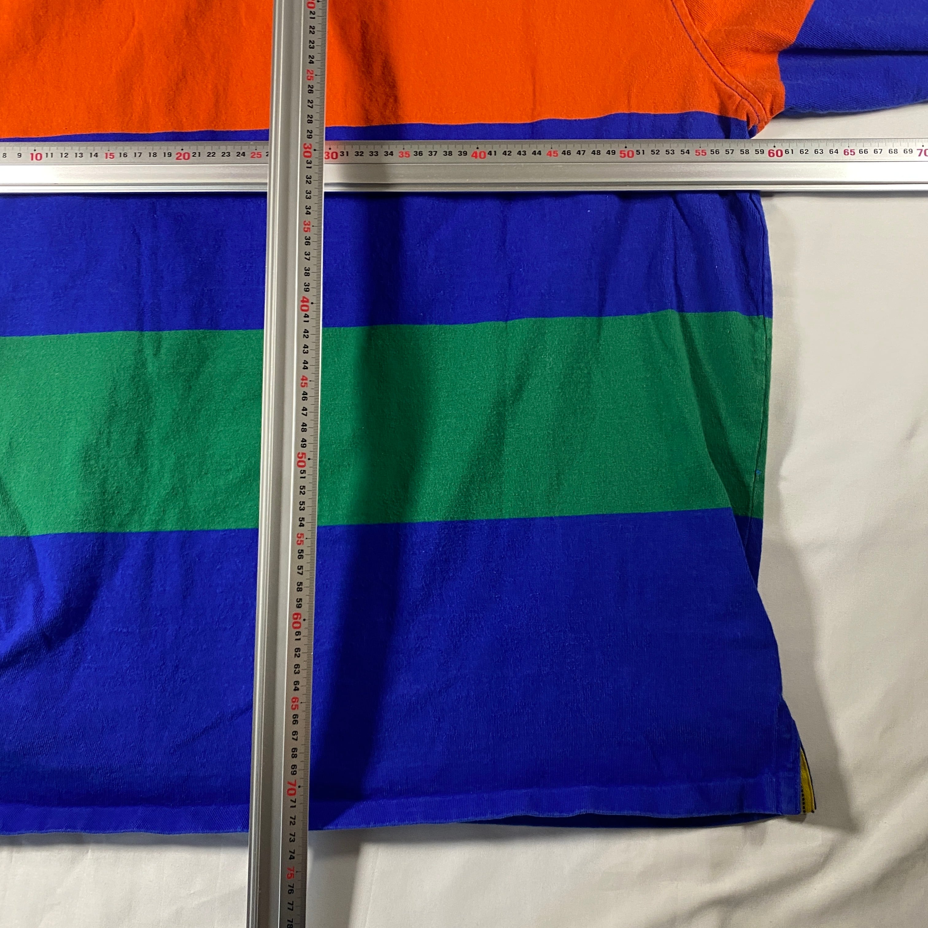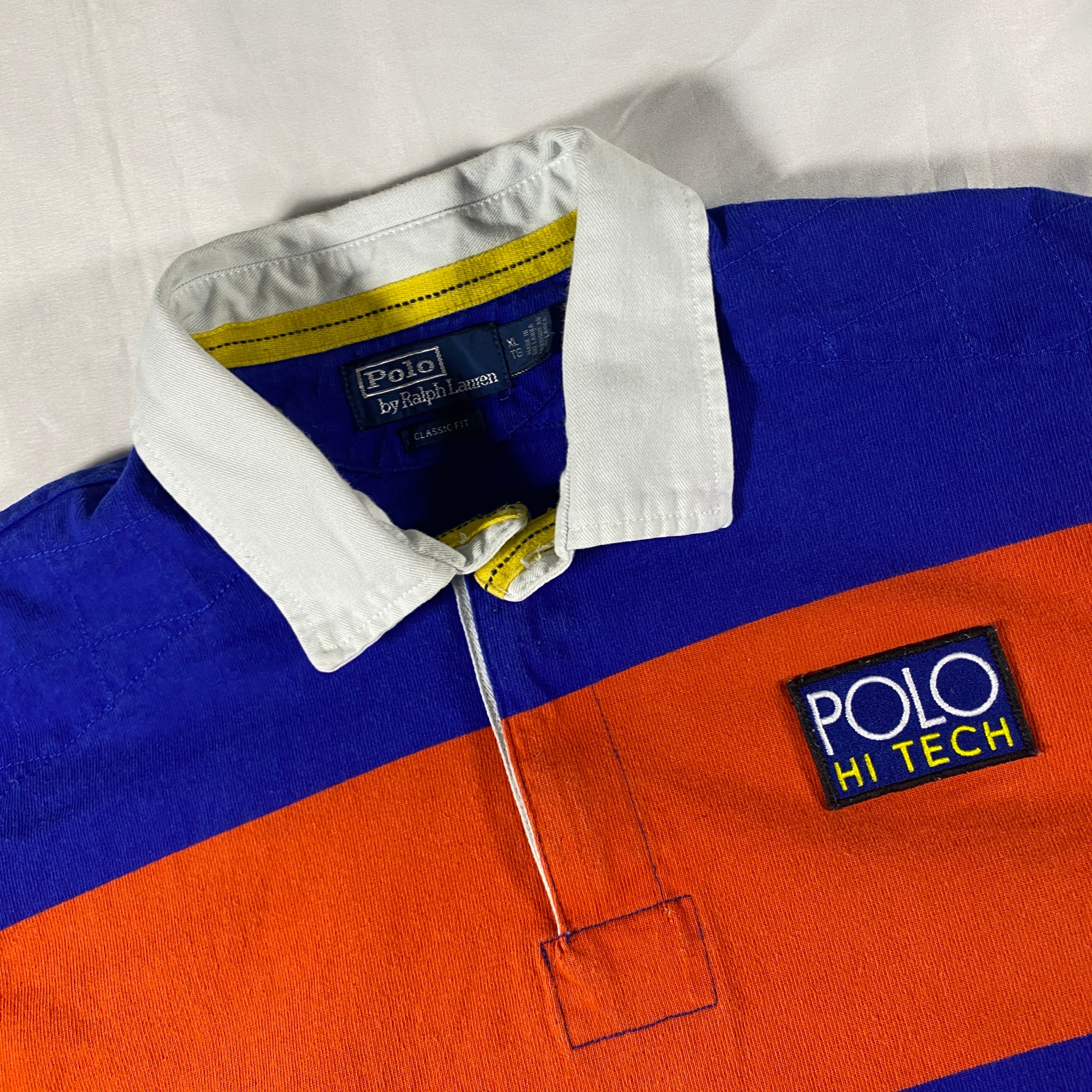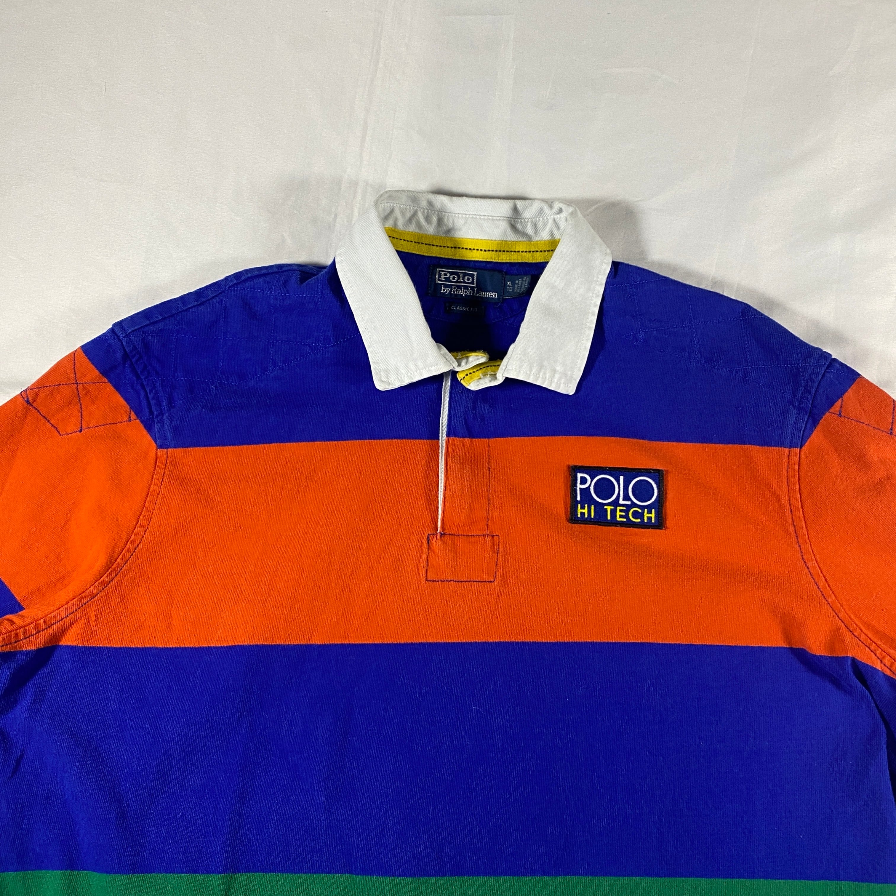 90年代Polo Hi Techラインを象徴するラガーシャツ。アウトドアとストリートを融合させたこのシリーズは、当時のラルフローレンの中でも異色かつ熱狂的な支持を集めた存在。大胆なマルチボーダー配色に加え、胸の“POLO HI TECH”パッチがしっかり主張。クラシックなラガーのディテールをベースにしつつ、都会的なカラーリングで完全に別次元へ。これ1枚で90sストリートの文脈が完成する、説明不要の主役級ピースです。